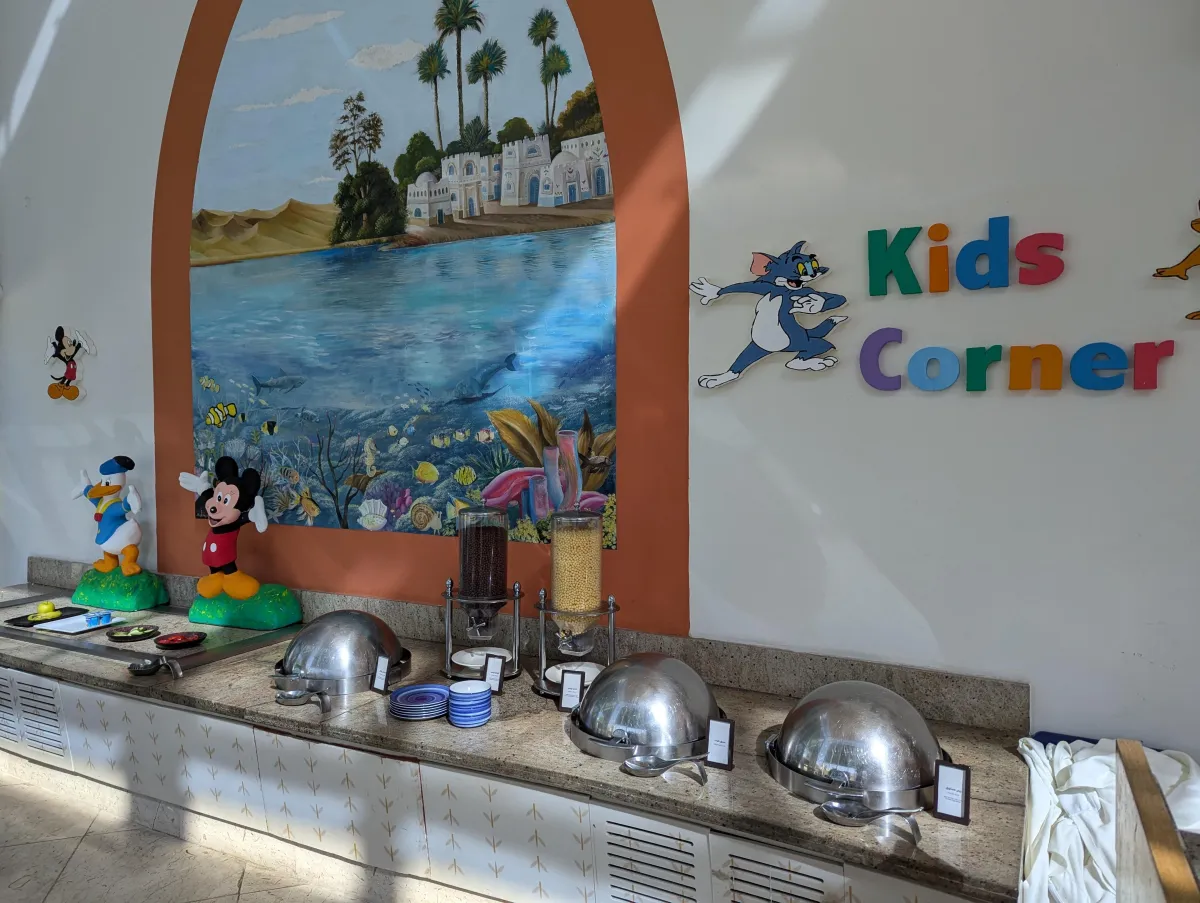Auswahl & Qualität: Im gesamten Hotel gilt "All inclusive" (AI) und somit können die Kinder zwischendurch immer etwas zu Trinken oder auch einen Snack bekommen. Das Hauptrestaurant Marsa hat eine Kinderecke mit eigenem kleinen Buffet, Kindertischen und -Stühlen sowie einen Fernseher, auf welchem seit 3 Jahren Abends "Ferdinand der Stier" (ohne Ton) läuft. Das Kinderbuffet bietet neben Nudeln und Pommes auch eine gute Auswahl an Obst und natürlich das Essensangebot der Erwachsenen. Es gibt noch drei weitere Restaurants, in welchen man "a la Carte" und mit entsprechendem Schwerpunkt (Fisch, Arabisch, Italienisch) essen kann.